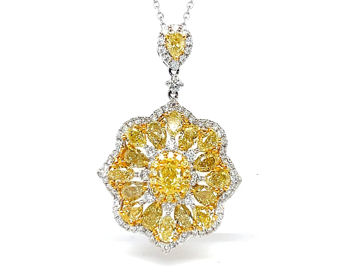 An intricate expression of movement and brilliance, this pendant tells a story of transformation. Handcrafted in 18k two-tone gold, it features a 0.39ct central yellow diamond, surrounded by 17 rich yellow stones (3.17ct), 14 lighter yellow accents (0.10ct), and 73 white diamonds (0.63ct). The design unfolds like petals around a sun, glowing with intensity and grace.